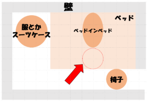 ✓ベッド上の夫婦の間足元側に枕を置いておく
