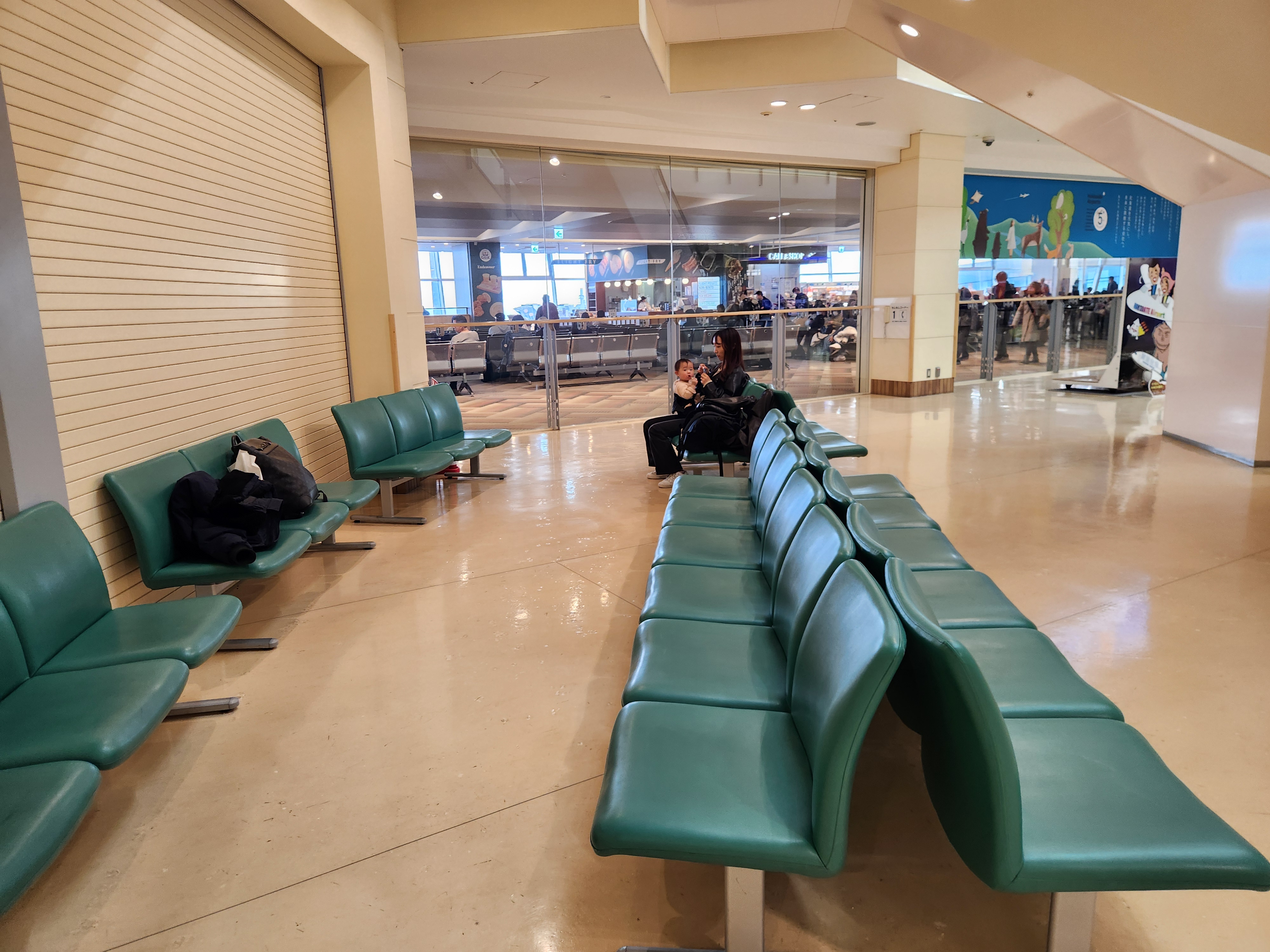 一目を気にしないですごしたいのであれば、到着ゲートの近くの壁のところが1Fで一番過ごしやすいかもしれません。