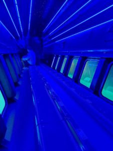 席はかなり狭く隣の人と肩がぶつかるくらいですね。閉所恐怖症の人や、人と距離が近い状態が苦手なひとはあまりおすすめできません。